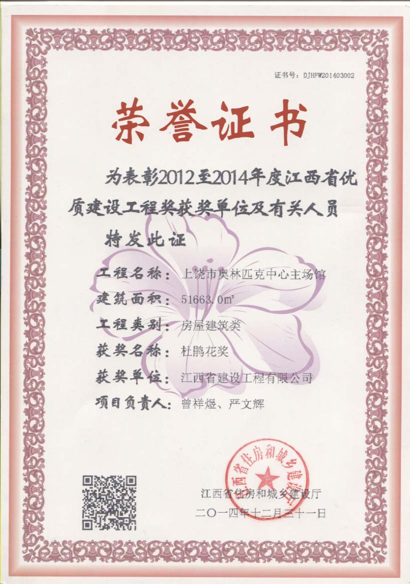 上饒奧體中心主場(chǎng)館項(xiàng)目榮獲“江西省優(yōu)質(zhì)工程杜鵑花獎(jiǎng)”